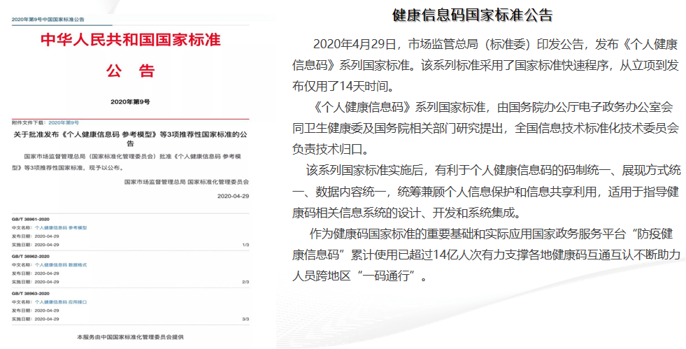 2020年4月29日,市場監(jiān)管總局(標(biāo)準(zhǔn)委)印發(fā)公告,發(fā)布《個人健康信息碼》系列國家標(biāo)準(zhǔn)。該系列標(biāo)準(zhǔn)采用了國家標(biāo)準(zhǔn)快速程序,從立項(xiàng)到發(fā)布僅用了14天時間。